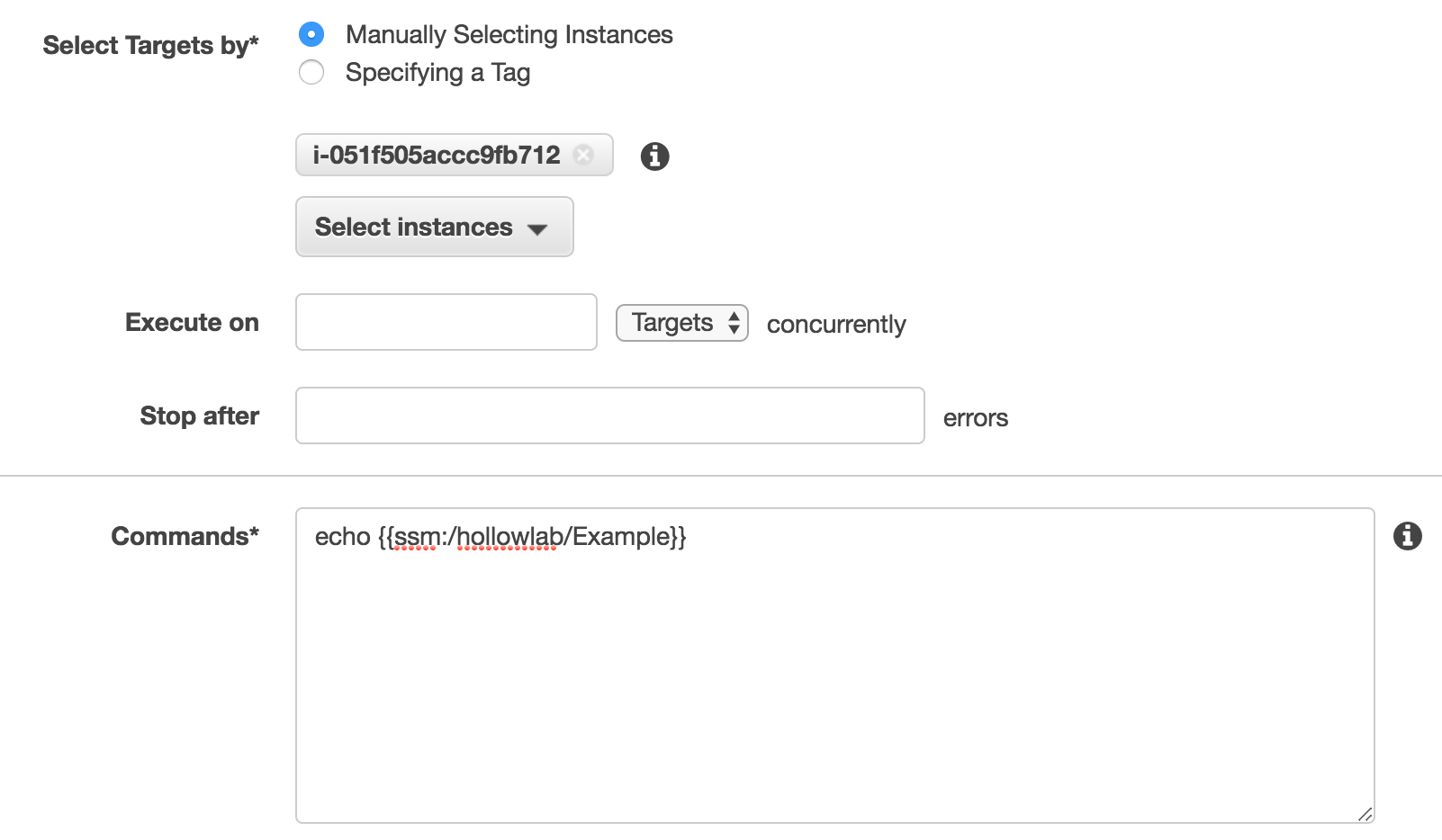 The next step is to select which instances we’ll be executing our command on. I’ve selected my Linux instance with the SSM Agent and role installed. After that comes the critical piece, the command. In the commands box, we’ll enter “echo {{ssm:/hierarchy/ParameterName}}” which will simply print out what the parameter value is. In my example I’ve used “echo {{ssm:/hollowlab/Example}}. Now clearly this is a silly exercise because all it does is print it to a screen, but should give you the idea about how it can be leveraged for those really important scripts that you’re dreaming up as you read this post.