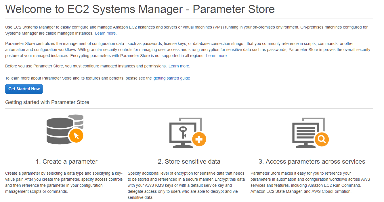 From within the Amazon EC2 console look for the Parameter Store hyperlink. If its the first time you’ve used parameter store, you’ll see a familiar screen from AWS that gives you some information about the service and a “Get Started Now” button. Click that button and let’s get started.