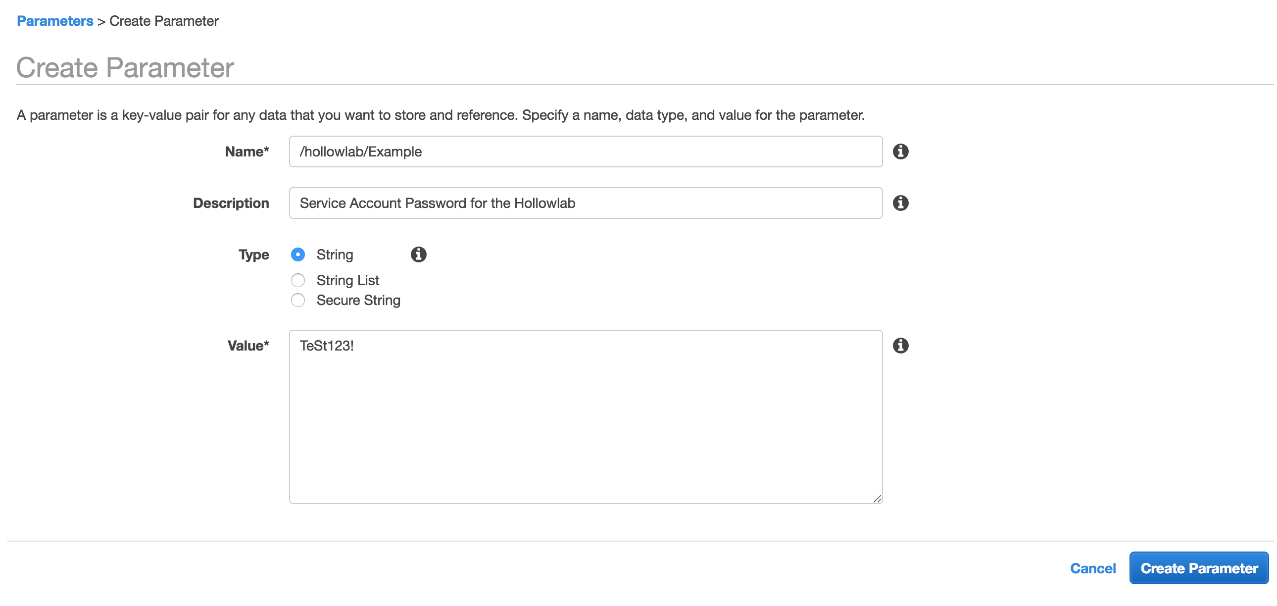 Now we can create our first parameter. In this case we’ll make believe that this is a service account password for use in my lab. We’ll first give it a name which I’ve called /hollowlab/Example. If you’re wondering about the slashes in that name, they’re used as hierarchies. If you have to manage a giant list of parameters all in a flat list it might be too cumbersome to sort through. A better way might be to organize these into hierarchies (think of a folder structure) so you can group parameters. Maybe you’d do this by department, division or application version or environment? Again, the complexities we’ll leave up to you. For now I’ve got a root hierarchy of hollowlab and a parameter named “Example”.