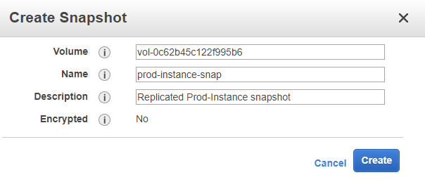 Click “Create Snapshot” to open up the snapshot window. From there select the volume that’s attached to your EC2 instance (this post assumes only a root volume) and then name your snapshot. You should also add a good description here for reference purposes later on down the road. When you’re done, click the “Create” button.