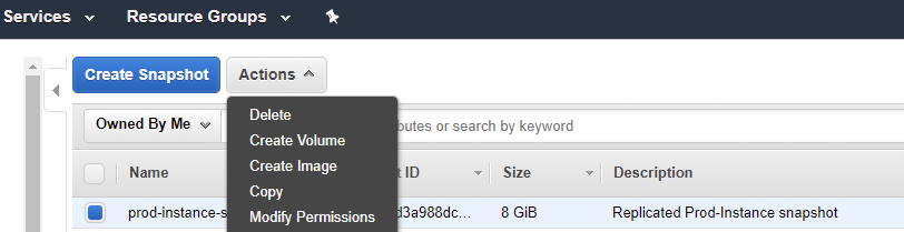 Once your snapshot has been created, select it from the menu and click the “Actions” button and then select “Copy” from the drop down menu.
