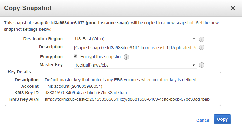 Here we select the region where we want the new instance to be created. We can modify the description and then notice that we have an option to encrypt the volume as part of the copy command. If we encrypt the volume we’ll need to select the key from the AWS KMS service that would be used to encrypt the volume. When you’ve set your configurations click the “Copy” button.