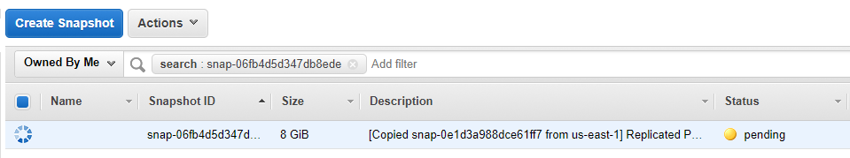 Now, if we change to the destination region in our AWS console, we can look for any snapshots that exist in that region. Depending on how long you wait before switching regions, you may see the snapshot that we’re in the process of copying over is in a pending state. Wait until the snapshot has finished copying to the new location before proceeding.