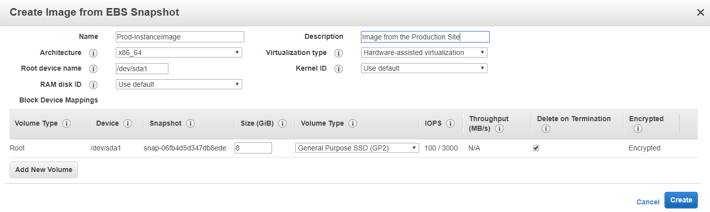 Once the snapshot is ready, select it and then click the “Actions” button and then the “Create Image” item in the drop down menu. This process takes the snapshot and creates an Amazon Machine Image (AMI - Pronounced: Ah-mee) which can be used to spin up new EC2 instances. Provide a name, the architecture, a description, the virtualization type and any size differences that you might want to make here. You’ll notice that the root volume here will be encrypted since we encrypted our snapshot when we copied it to the secondary region. When you’re done, click the “Create” button.
