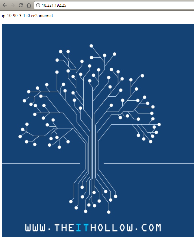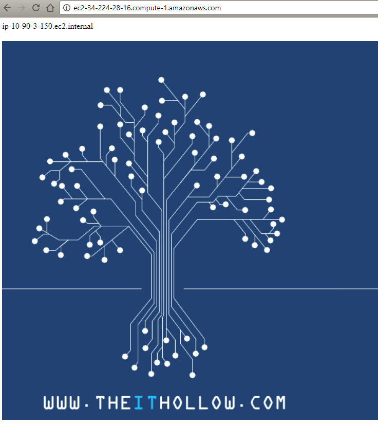 Before we begin, lets make sure my web server is running in an optimal state. I’ll go to the EC2 console and find the public address for my EC2 instance and browse to it through my web browser. Yep, my EC2 instance is providing my web page which lists the internal IP Address and my logo. This internal IP Address is automatically added to the web page through the user data parameters provided at boot up.