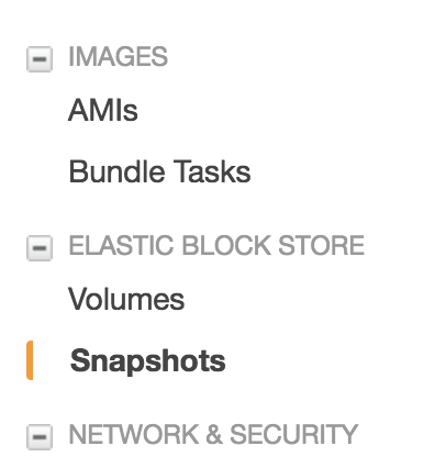 Next we want to take a snapshot of the instance from the EC2 console. Go to your EC2 console and navigate to the “Snapshots” item in the left hand menu.