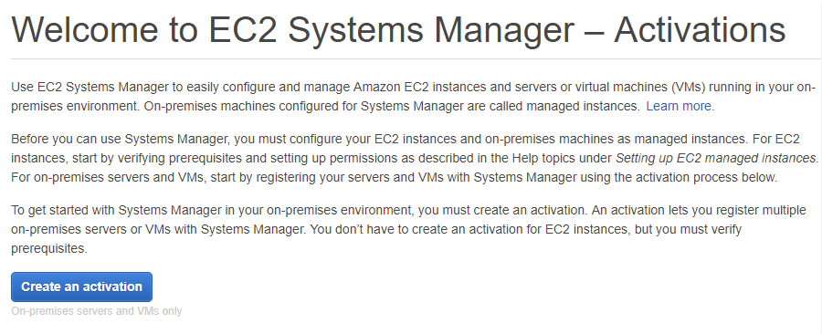 Now that the AWS role has been created, we can focus on how we can get our VMs connected with the AWS SSM service. To do this, we need to create a Managed Instance Activation. To do this go to the EC2 console and click on “Activations” under the “Systems Manager Shared Resource” group in the navigation pane.