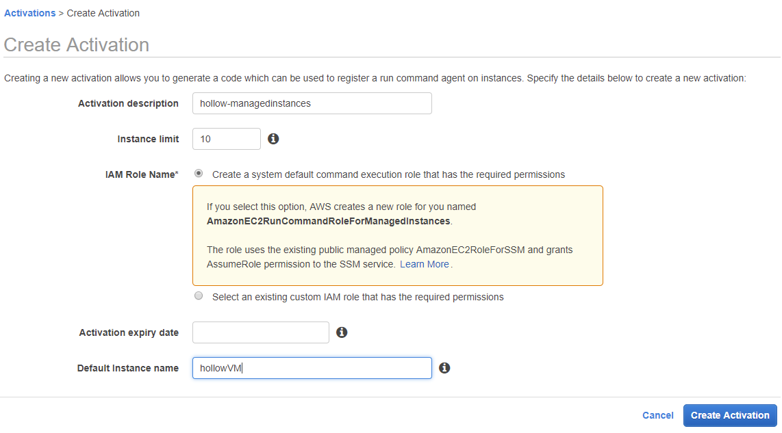 On the first screen, give the activation a description and an instance count. The instance count makes sure that only a certain number of instances are being used. After that select the “Create a system default command execution role that has the required permissions” so that the automation services can act on your behalf within AWS. You may also enter a date when the activations will expire and a default instance name which is how the machines will show up in the EC2 console.