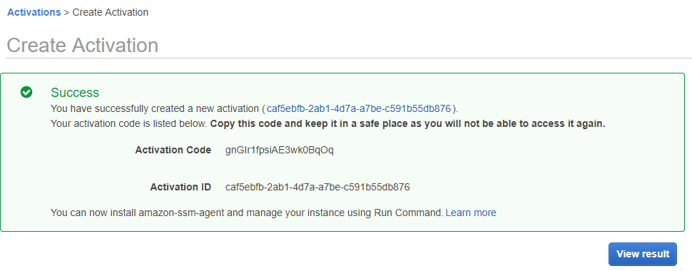 That makes sure that my guest has the agent installed, but not running. Before I start the service on my guest I also need to register the node with AWS when that agent starts up. To do that I run the following code on my guest. You’ll notice two sections labled “code” and “id” which come from the create activation screen above. Remember the Activation Code and Activation ID? Place those in the code snippet below and run it.