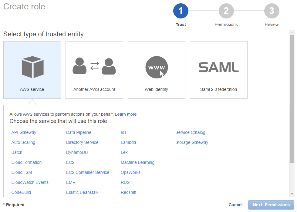 In the create role wizard, select the “AWS service” trusted entity and then click on EC2.