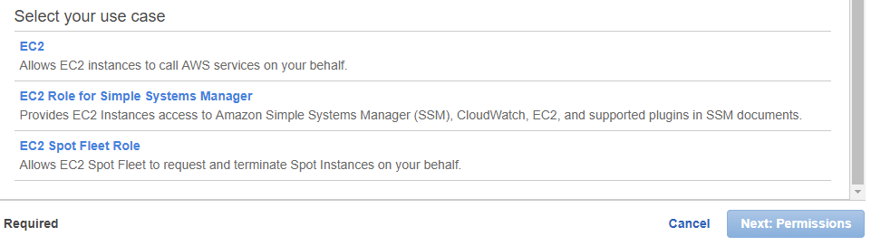 Then select “EC2 Role for Simple Systems Manager” as your use case. Click “Next: Permissions” button.