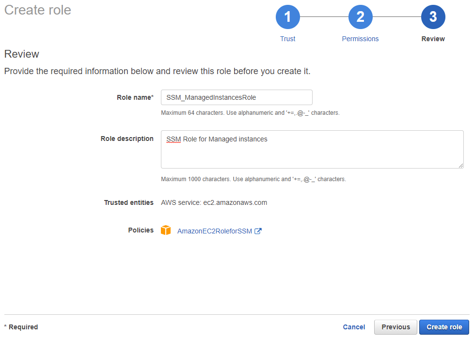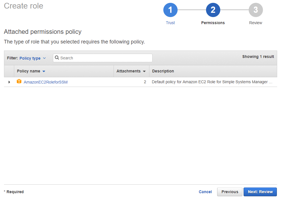 ON the permissions page make sure that the AmazonEC2RoleforSSM is listed and then go ahead and click the “Next: Review” button.
