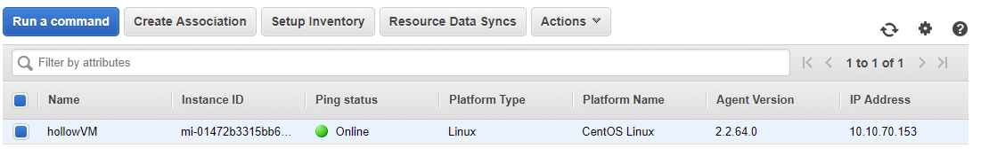 It might take a minute or two to register, but you can go to the “Managed Instances” screen within the AWS EC2 console navigation pane and you should see a new managed instance. Note that the name matches what we placed in the Activation screen. You can also see that the IP Address is listed and this is the local IP address from my vSphere environment.