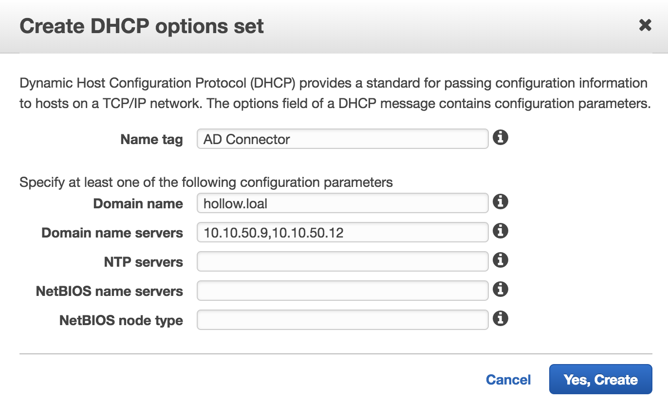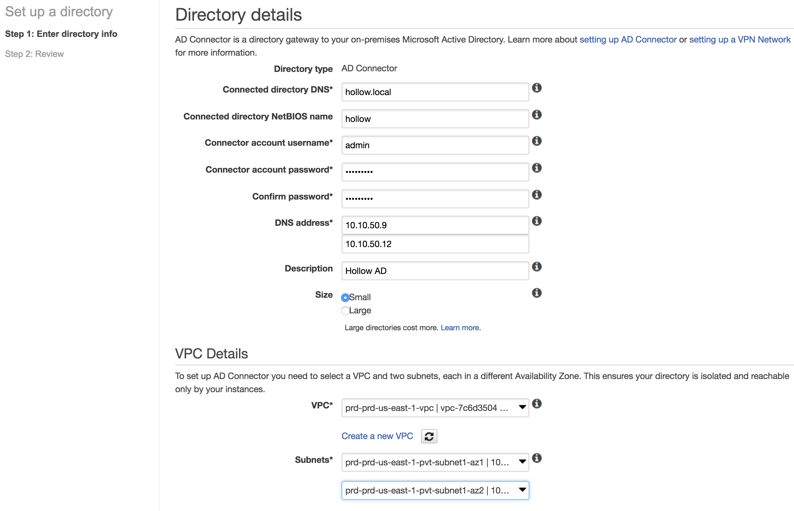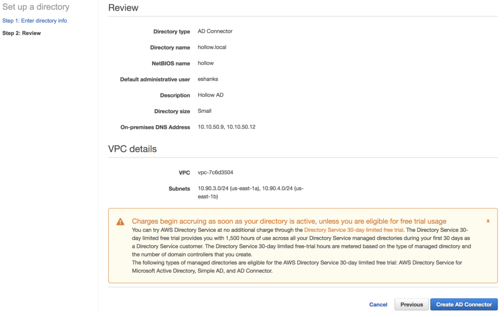 To setup a new directory, first enter the AD DNS Name for the AD Domain you’ll be connecting with. You can optionally provide a NetBIOS name if necessary. Next, enter a username and a password for a user that has permissions that we discussed above. After this, you’ll need to specify the DNS address for your domain. This should be the IP Address of your DNS Servers which in my case are also my domain controllers. You’ll also need to decide which VPC your AD Connectors will live in, and which subnets. Rememeber that these subnets need to be able to communicate with your existing AD instances so if they are on-premises you’ll need a VPN or Direct Connect. If they live within your AWS environment, make sure that those subnets can communicate with the ones specified in this window.