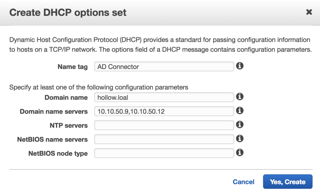 You’ve connected your domain controllers with AWS now, but your clients will need to be reconfigured to use these two domain controllers for their DNS resolution. To provide this for the entire VPC, we’ll want to create a new DHCP Option Set and assign it to the VPC that will use these Domain Controllers. Go to your VPC menu in the console and find the DHCP Options Set link. Create a new option set with the Domain name and DNS servers from your new on-premises AD servers that we just connected.