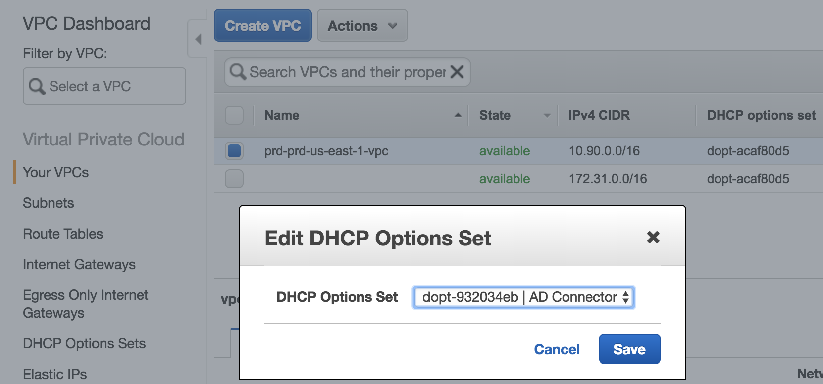 Once you’ve created the options set you’ll need to associate it with your VPC(s) so that new addresses are handed out with the appropriate settings. NOTE: You can only have one DHCP option set associated with at VPC at a time. To assign the new Option Set, select the VPC from the VPC menu and click the actions button, then select the Edit DHCP Options Set link. You’ll then have a drop down to select your preferred option set.