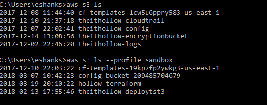 When it’s all done, you can run the same commands you normally would, but specify the –profile [profile name] command and the cli will run the command in the correct account. Below is an example of two identidal commands that are in different aws accounts specified by the profile switch.