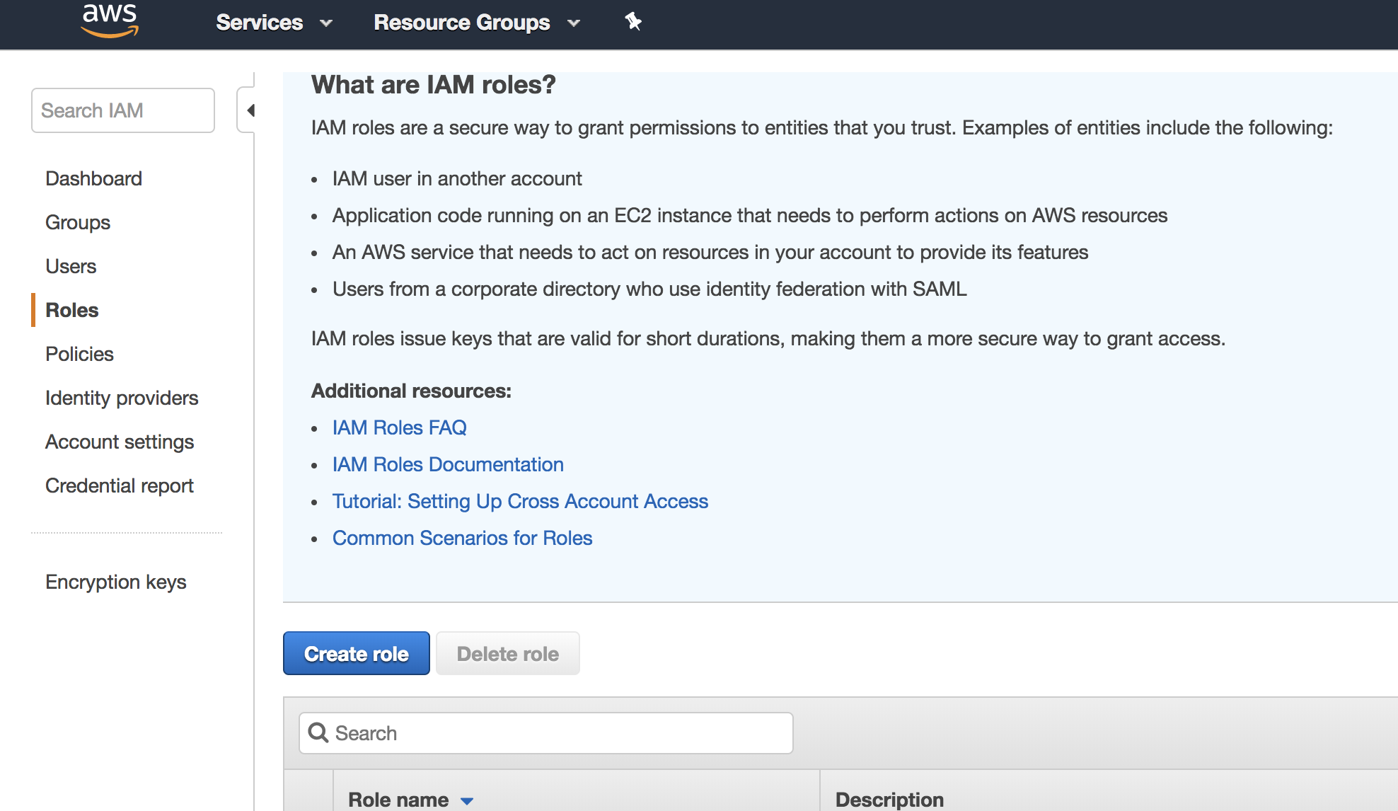 Open the IAM console and go to Roles. Click the “Create role” button.