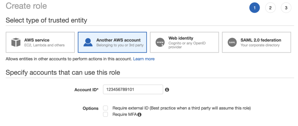 Under the type of trusted identity select the “Another AWS account” option. From there you’ll need to enter in the source account number that will have access to assume this role in this destination account. You could also require MFA or an external ID but that is not covered in this blog post. External ID cannot currently be used through the console so be aware of that. Click the “Next:Permissions” button.