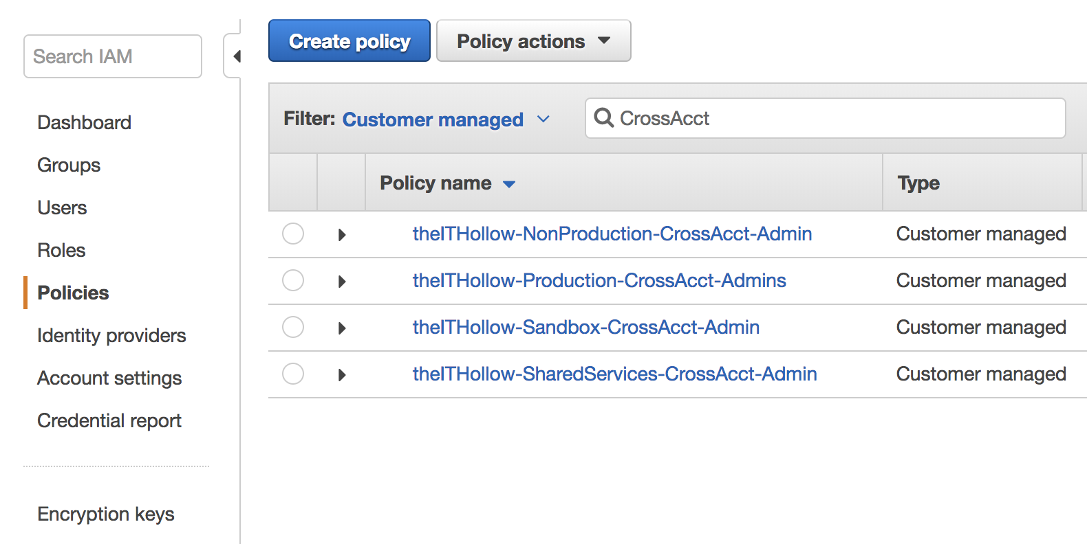 Next we’ll move to the source account or the gateway account that logins are funneled through. So login to the source account and go to the IAM console again. The main task here is that you must add a permission to the users who will have access to the destination accounts. This is done by creating a new policy allowing the assume role permission on the user, group or role that is being provided access.