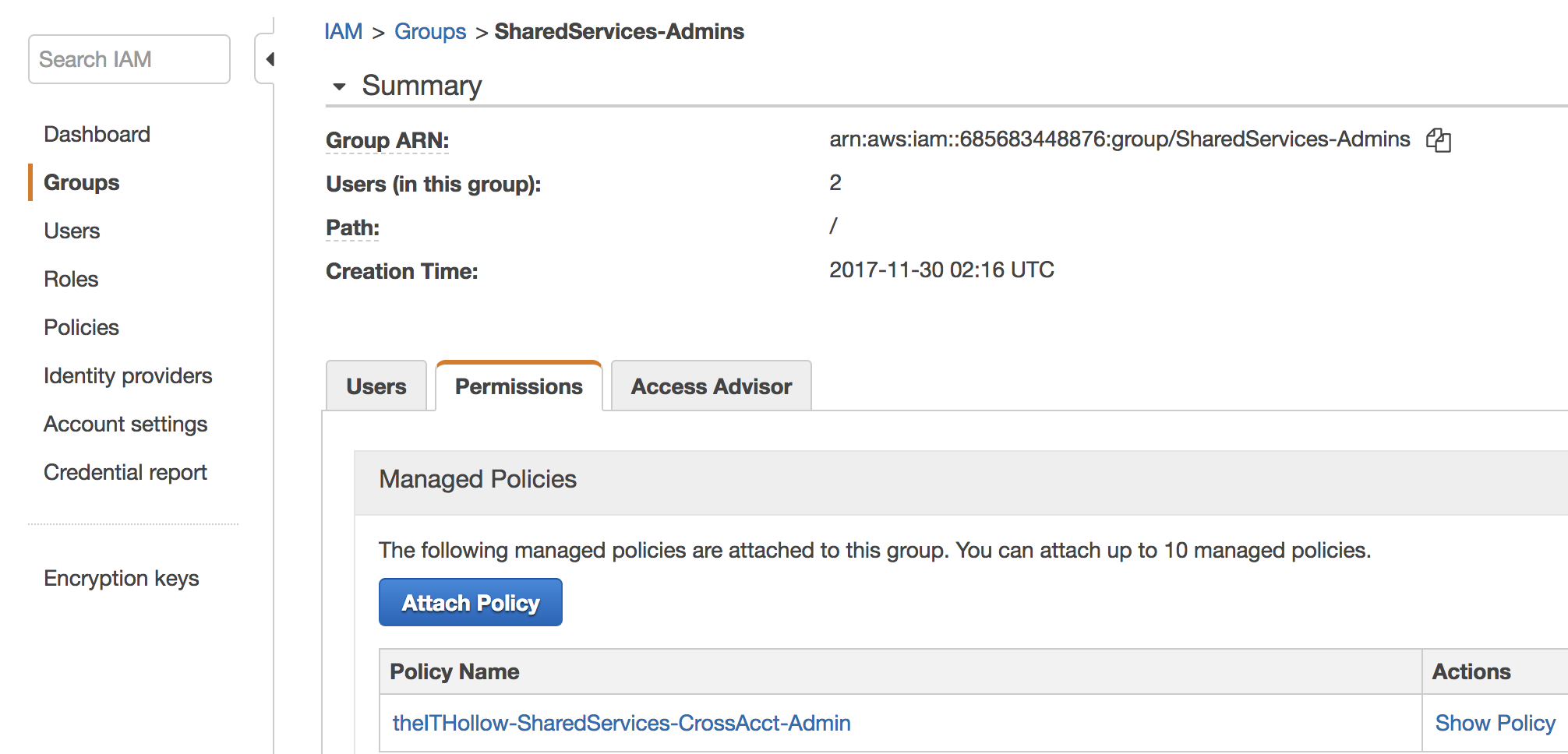 The next step would be to attach this policy to a user (less preferred) or group (more preferred) that will have access to assume the role in the destination account. I prefer to create a group for each of my accounts and attach a policy specifically to that account as seen in the screenshots below.
