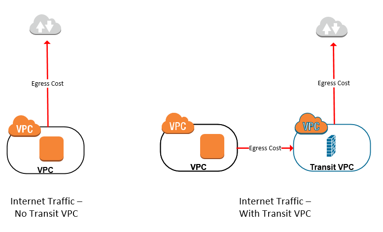 A more difficult cost consideration is around your network traffic. AWS charges you for any network traffic exiting (egress) your VPC. In the diagram below (left), you can see how this works with a single VPC directly accessing the Internet. On the right side, you can see what happens to egress costs when you have a transit VPC instead. With a transit VPC we’d get billed twice for the traffic because it exits two VPCs. Keep this in mind for traffic inter-VPC as well, between a Shared Services and Prod environment for example.