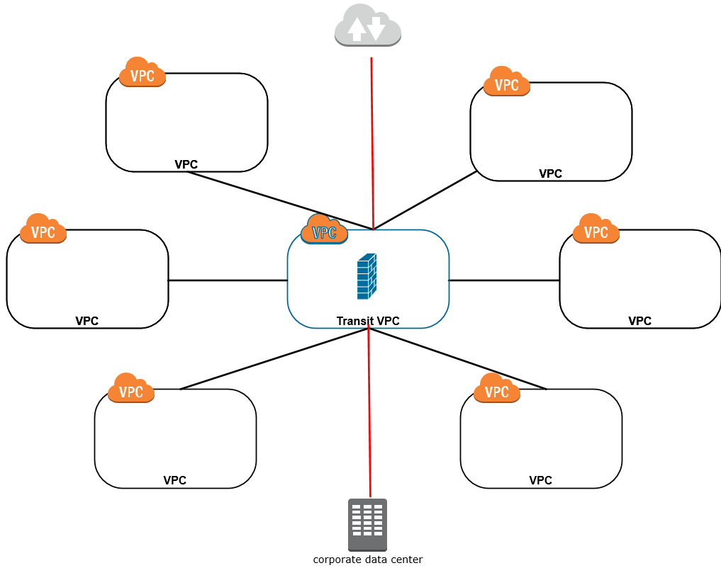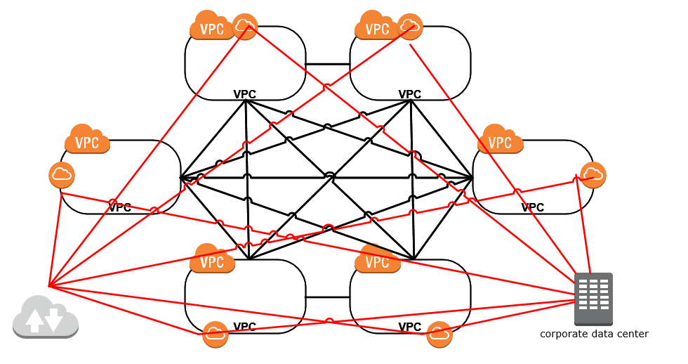 How do you want to manage your traffic out to the Internet, or in from the Internet? Do you allow traffic in and out of each of your VPCs? You can certainly do just that, but how comfortable are you with having multiple egress or ingress points to your environment? The diagram below shows a full mesh of VPCs again, this time adding a red line for an Internet connection and a connection back to your on-premises data center.