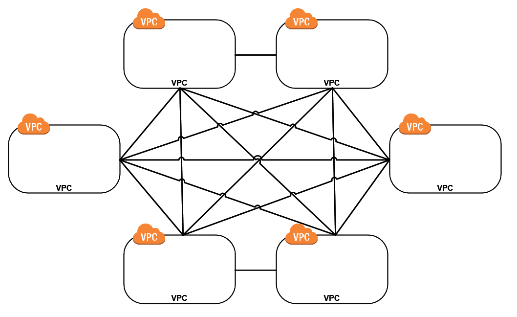 If you’ve got a multi-account, multi-VPC strategy for your deployments, connecting all of those VPCs together can be a real mess. If you’re implementing peering connections for a full mesh, the formula to calculate that is: [ (n-1)*n]/2. Setting this up and managing it can be a real chore. Take a look at the below example to see how you can quickly get overwhelmed by the number of connections to maintain. Think how this changes every time you add a new VPC.
