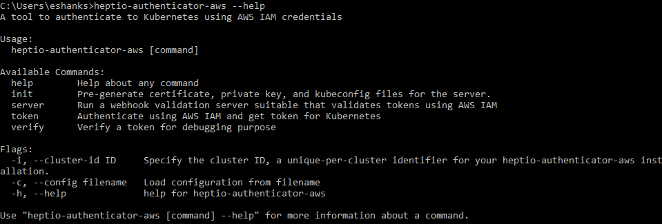 - aws-iam-authenticator - The IAM authenticator is used to integrate your AWS IAM settings with your Kubernetes RBAC permissions. To install this, download the executable for Windows from here: https://amazon-eks.s3-us-west-2.amazonaws.com/1.11.5/2018-12-06/bin/windows/amd64/aws-iam-authenticator.exe and place it in your file path. To test that its working, run: