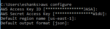 - AWS CLI - To install the AWS CLI, download and run the installer for your version of windows. 64-bit version , 32-bit version. Once you’ve completed running the installer, you’ll need to configure your client with the appropriate settings such as region, access_keys, secret_keys and an output format. This can be accomplished by opening up a cmd prompt and running aws configure. Enter access keys and secret keys with permissions to your AWS resources.