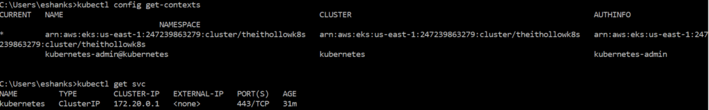 If things are working correctly, we can run kubectl config get-contexts so we can see the AWS authentication is working. I’ve also run kubectl get svc to show that we can read from the EKS cluster.