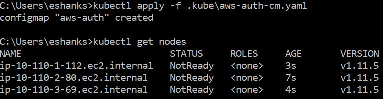 After we run the command our cluster should be fully working. We can run “get nodes” to see the worker nodes listed in the cluster.