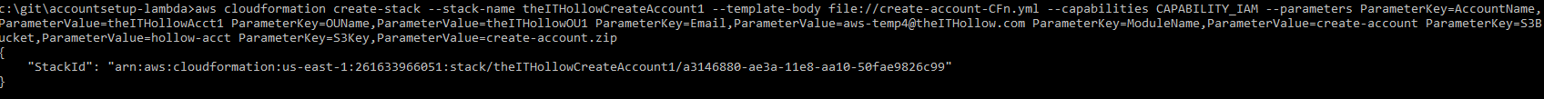 aws cloudformation create-stack --stack-name theITHollowCreateAccount1 --template-body file://create-account-CFn.yml --capabilities CAPABILITY_IAM --parameters ParameterKey=AccountName,ParameterValue=theITHollowAcct1 ParameterKey=OUName,ParameterValue=theITHollowOU1 ParameterKey=Email,[email protected] ParameterKey=ModuleName,ParameterValue=create-account ParameterKey=S3Bucket,ParameterValue=hollow-acct ParameterKey=S3Key,ParameterValue=create-account.zip