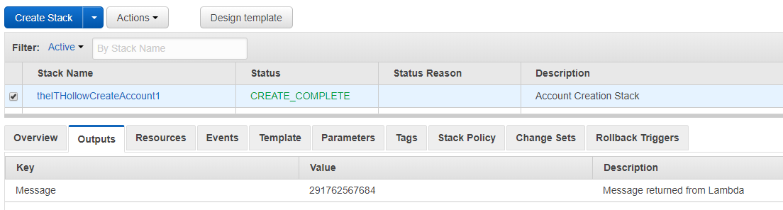 After a minute, you’ll see that the CFn stack has been deployed successfully, and that the output for the stack is the account number for the new AWS account.