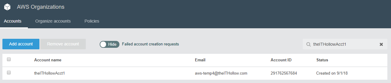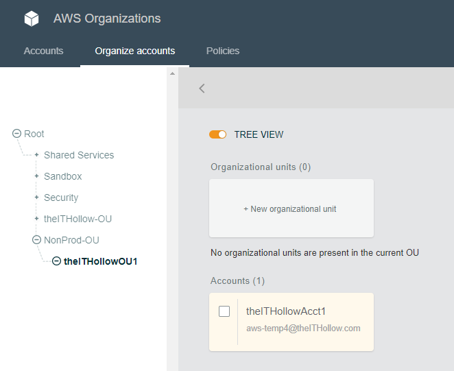If we open up the AWS Organizations console, we’ll see that the new account was created and the account number matches our output from the screenshot above.