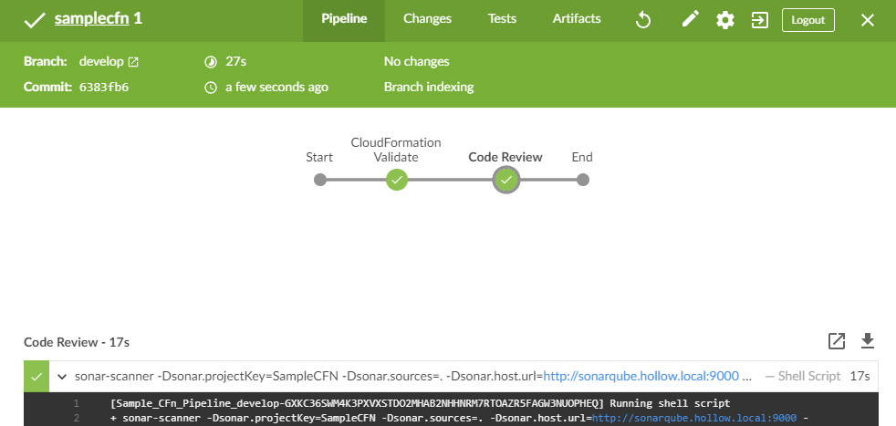 Through a Bitbucket web hook, my Jenkins server ran the newly commit code through my pipeline. First validating the CFn against the AWS CLI. Since it passed the first gate, the code was also then reviewed through SonarQube. If the first stage failed, the second stage wouldn’t run. This is by design to keep unnecessary processes from running. If your stage fails, all efforts to fix that code should be prioritized until its working again.