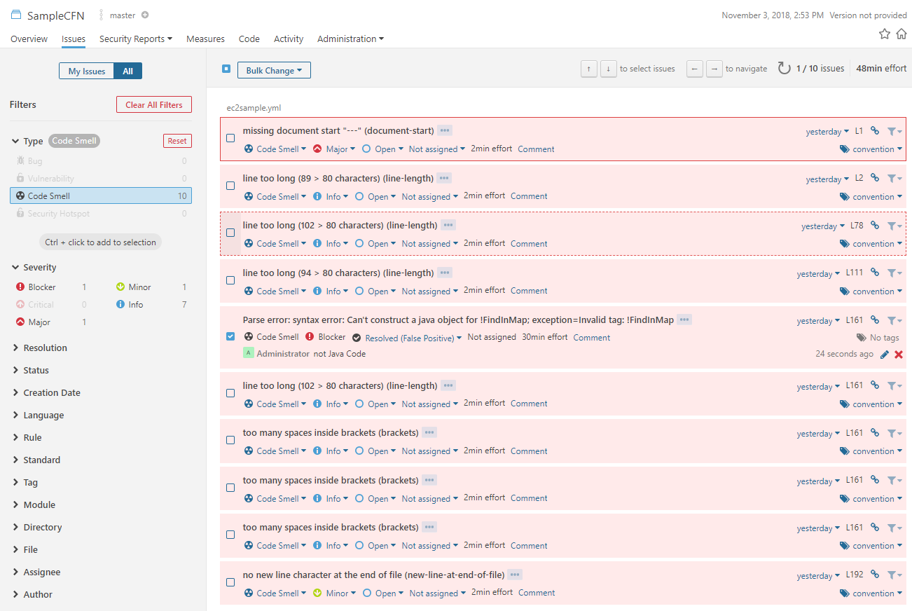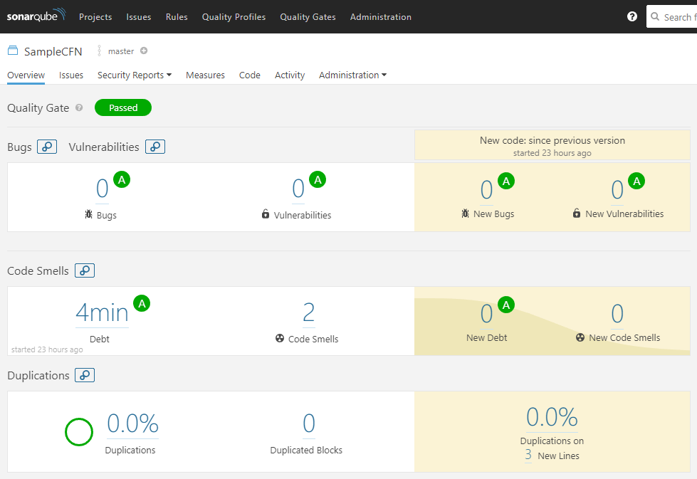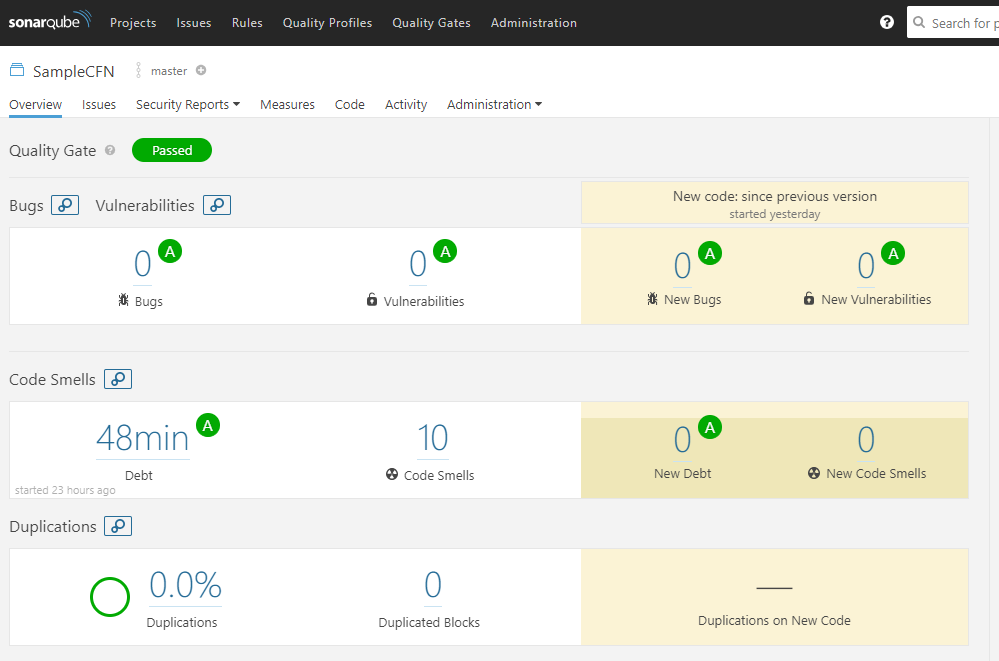 The first test Jenkins will run is to execute the validate-template from the AWS CLI. This tests the code to make sure that it could run if I deployed it to AWS. The second test will be to lint the code through a plugin in SonarQube for YAML files. SonarQube community edition was used to get a view of how the code looks, or better said, “Smells”. SonarQube might not know if the template could be deployed to AWS, but it will shows us some information about the quality of the code that has been written.