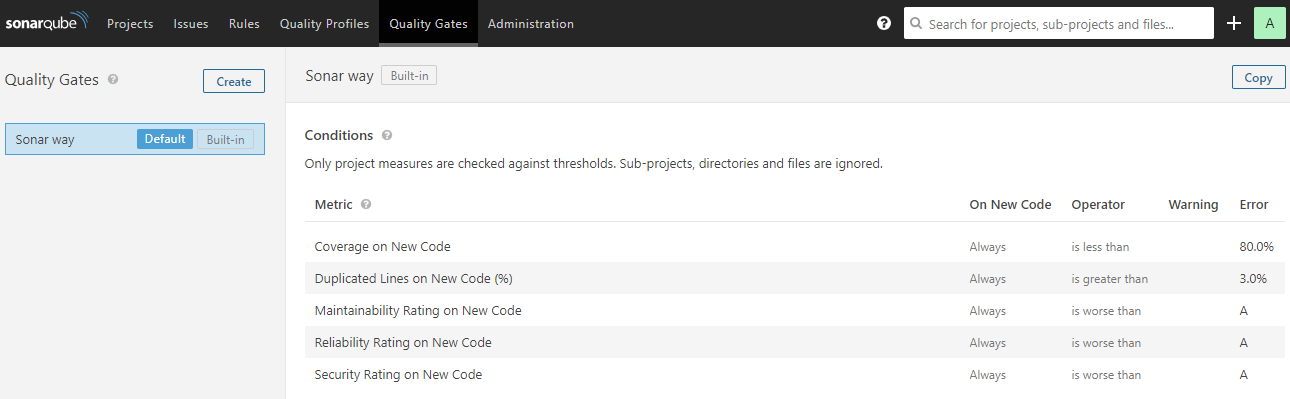 Whats better, is if the code smells really bad, a quality gate can be added to prevent the code from being merged to the bitbucket master branch. This takes some extra configuration which isn’t shown here but I’ve got an “A” rating here anyway. You can view the things that affect your quality gates in a different SonarQube tab. You can also create your own Quality Gates that match your own rules.