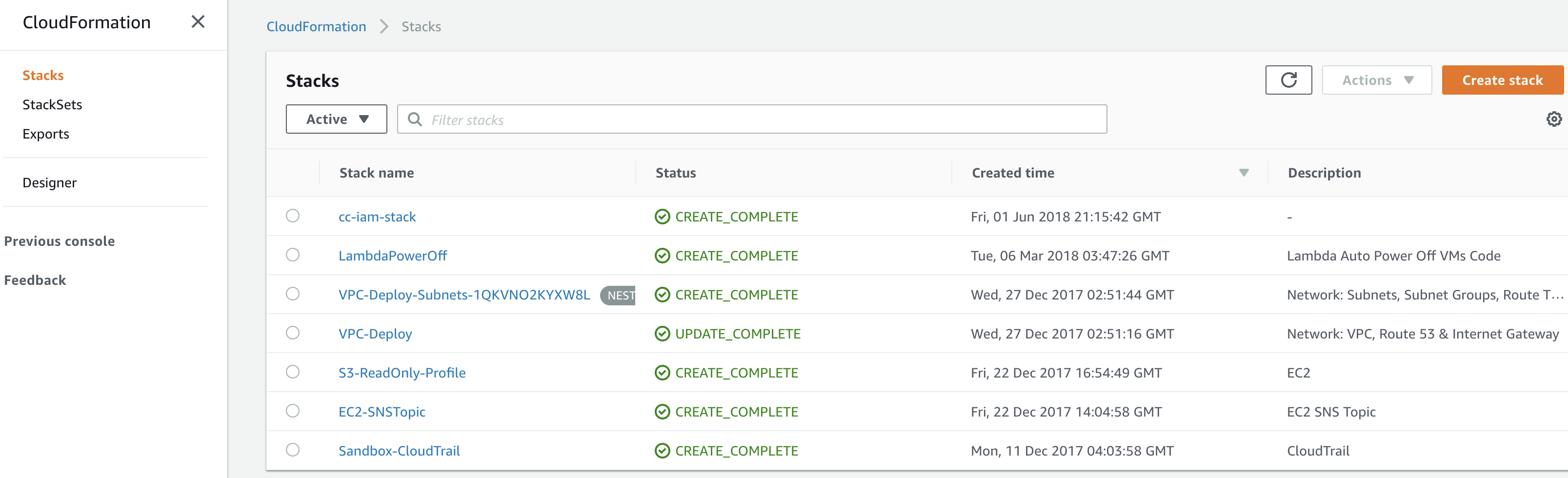 Now that the new feature has been released, lets take a look at it in a lab. The screenshot below is a list of CloudFormation templates that have been applied in one of my lab environments. Obviously, I’m always updating my infrastructure through code so I should have nothing to worry about, but lets test this new feature out anyway, just for fun.
