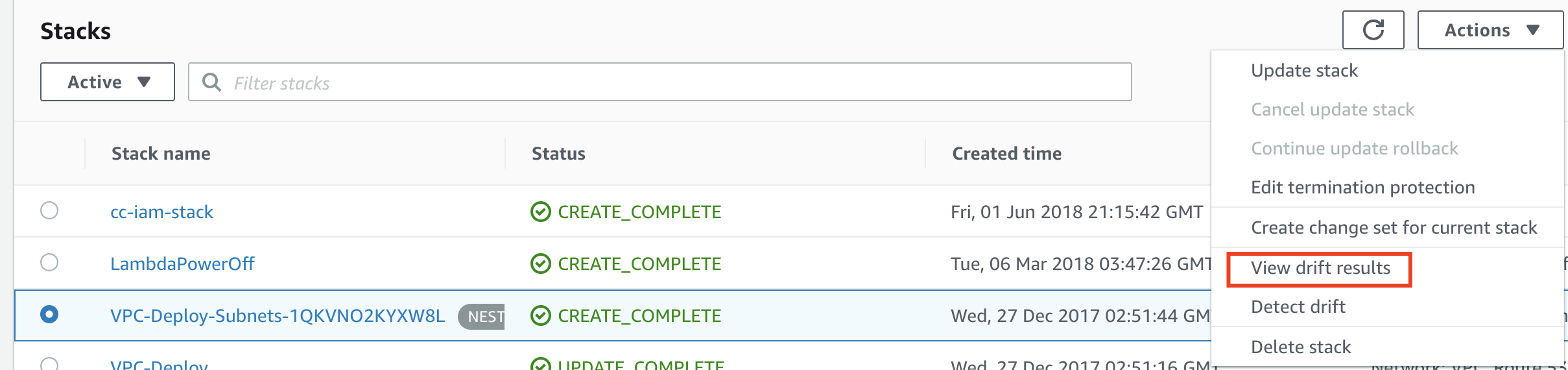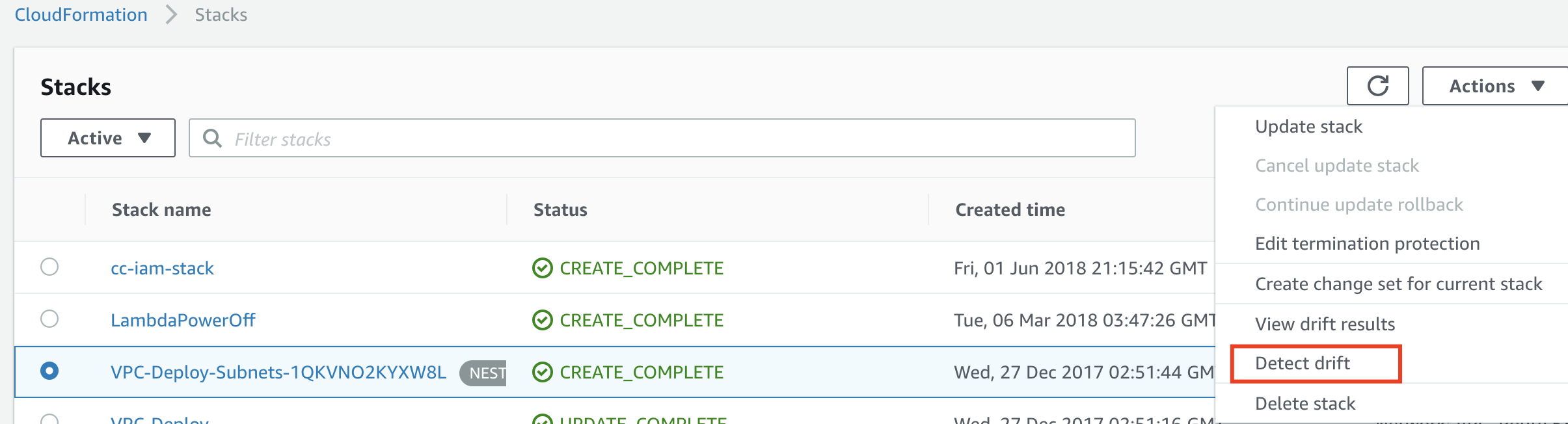 I’ve selected one of my stacks and then hit the Actions drop down and selected the “Detect Drift” option. Notice that this is also a nested stack and it will work just fine.
