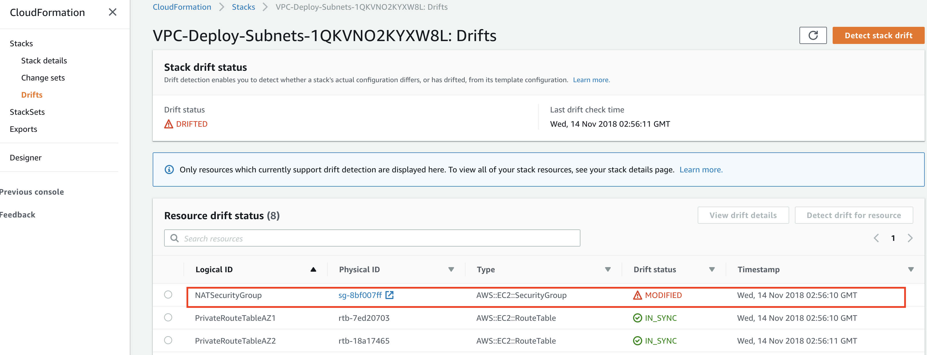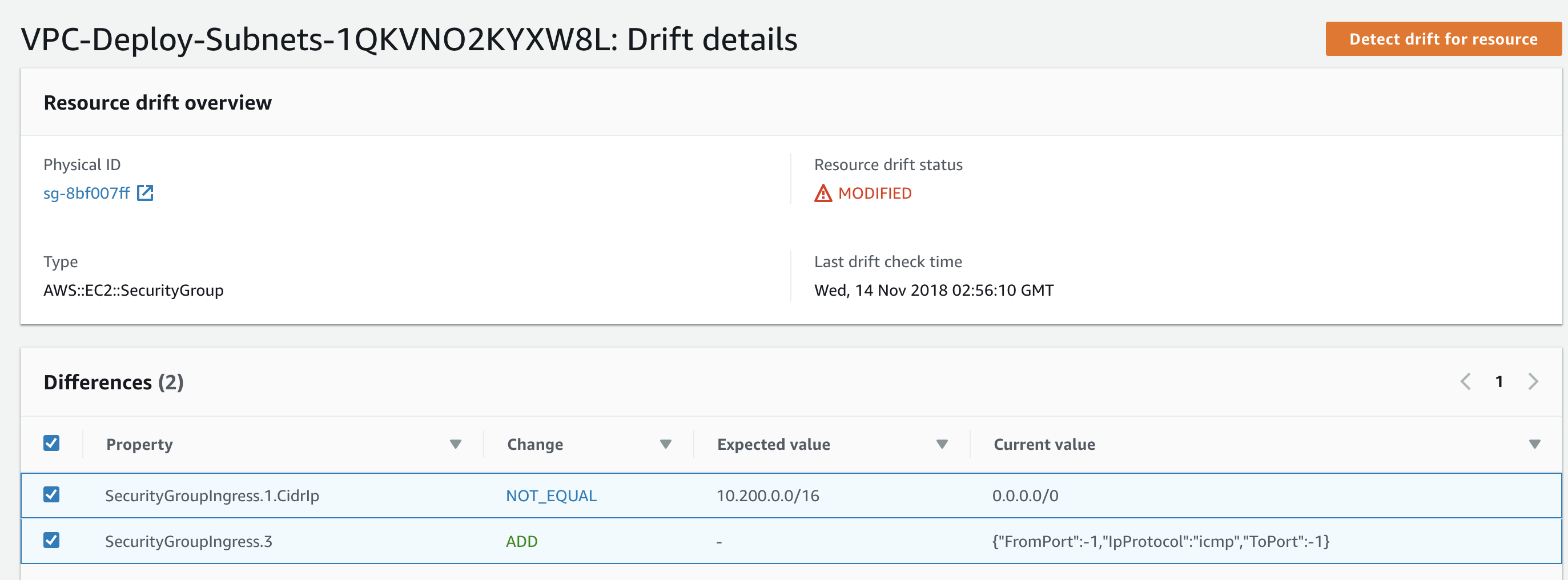 The drift detection page opens to show… wait a second! Apparently I’d made a manual change to a security group somewhere along the way and the drift detection capability has shown me what doesn’t match my template any more.