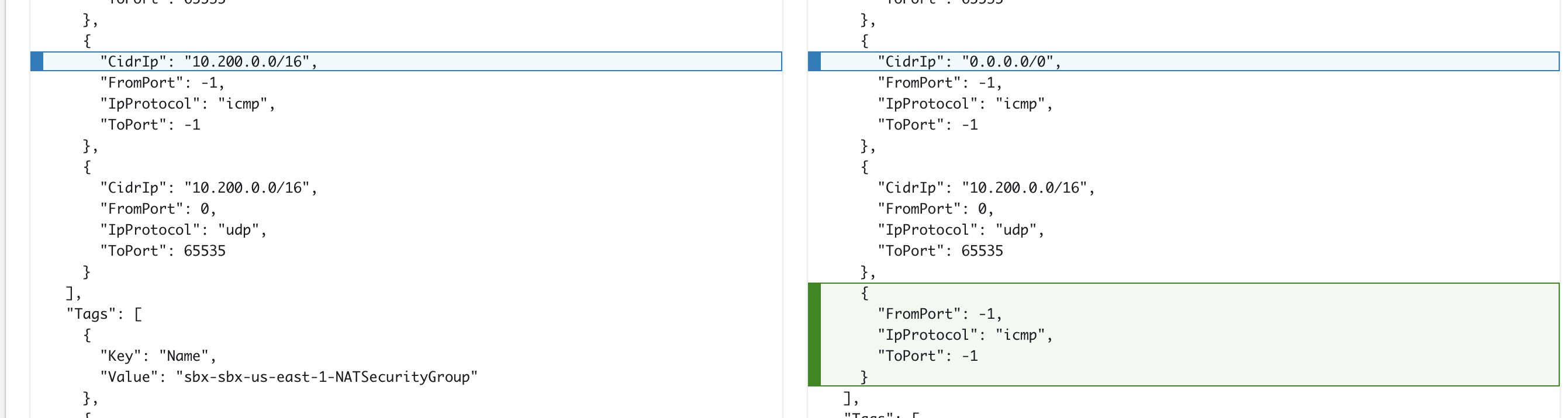 If we select the resource that has drift, we can select the “View drift details” button to get more information about the drift. As we can see from the following screen, I have replaced one of my source addresses with an anywhere (0.0.0.0/0) rule.