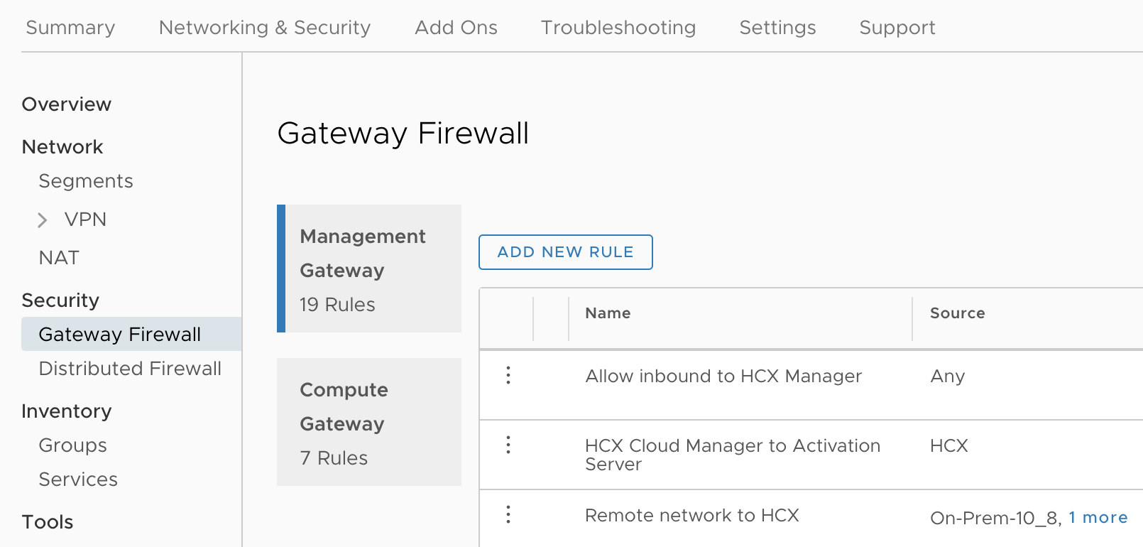 The second firewall we’ll discuss is the gateway firewall. This is like a perimeter firewall for your VMware Cloud on AWS environment. If you want to be able to access your vCenter and your workloads, this firewall will need to be configured. The gateway firewall consists of two parts, a management gateway firewall and the compute gateway firewall. The rules created for vCenter, SRM, and any of the components that VMware manages for you in the cloud are built in the management gateway firewall. Any of your workloads that would get deployed in the VMC would be done in the compute gateway firewall.
