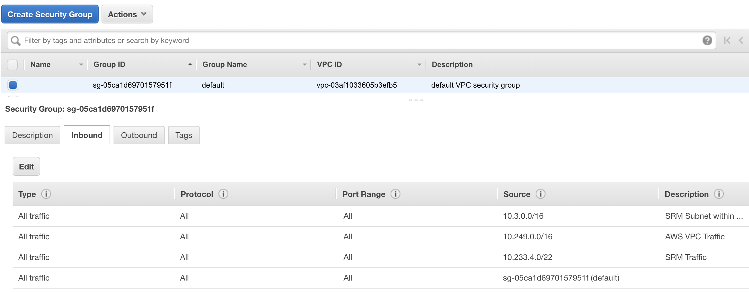 The last one is an example of a resource in AWS that is trying to communicate to VMC resources. AWS requires that a security group (even an allow all group) be assigned to each EC2 instance that is deployed. In fact as of the time of this post, you can add five security groups to an EC2 instance at a time. This is the same type of security group that was applied earlier to the ENI for the VMware Cloud Gateway. This firewall rule is optional unless you want your EC2 instances to be able to communicate with your VMC environment. If you require VM to EC2 instance connectivity it must be configured.
