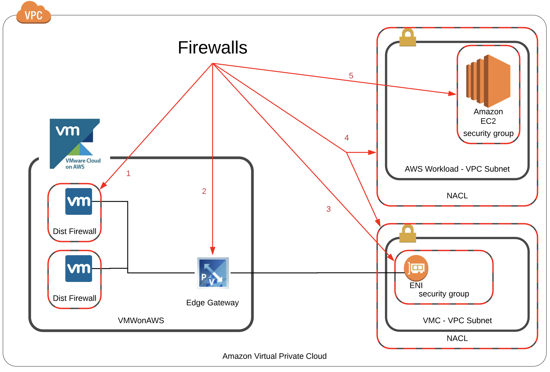 The diagram below shows each of the firewalls that might live between a virtual machine within your VMware Cloud on AWS environment and an Amazon EC2 instance in a subnet within the same VPC.