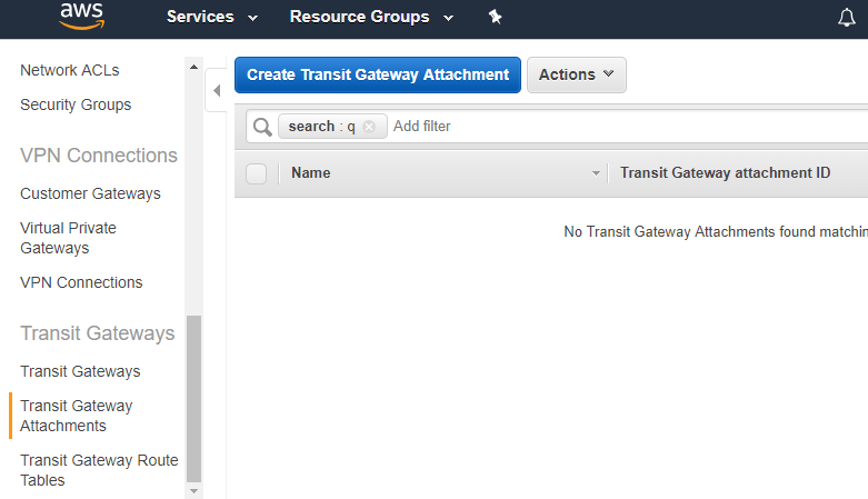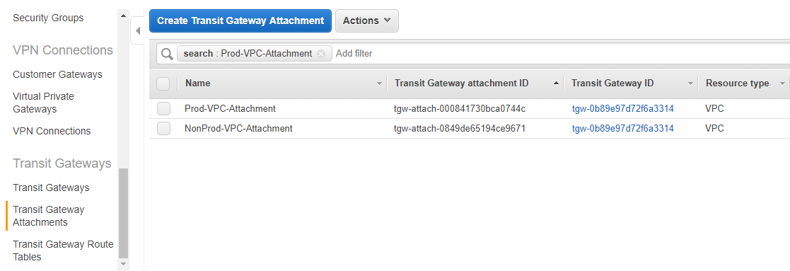 Now, our VPC should be connected properly, lets connect a VPN to the Transit Gateway as well. To do this, we’ll go back to the account where the Transit Gateway was created and navigate to the “Transit Gateway Attachments” menu. Within this screen we’ll create another attachment.