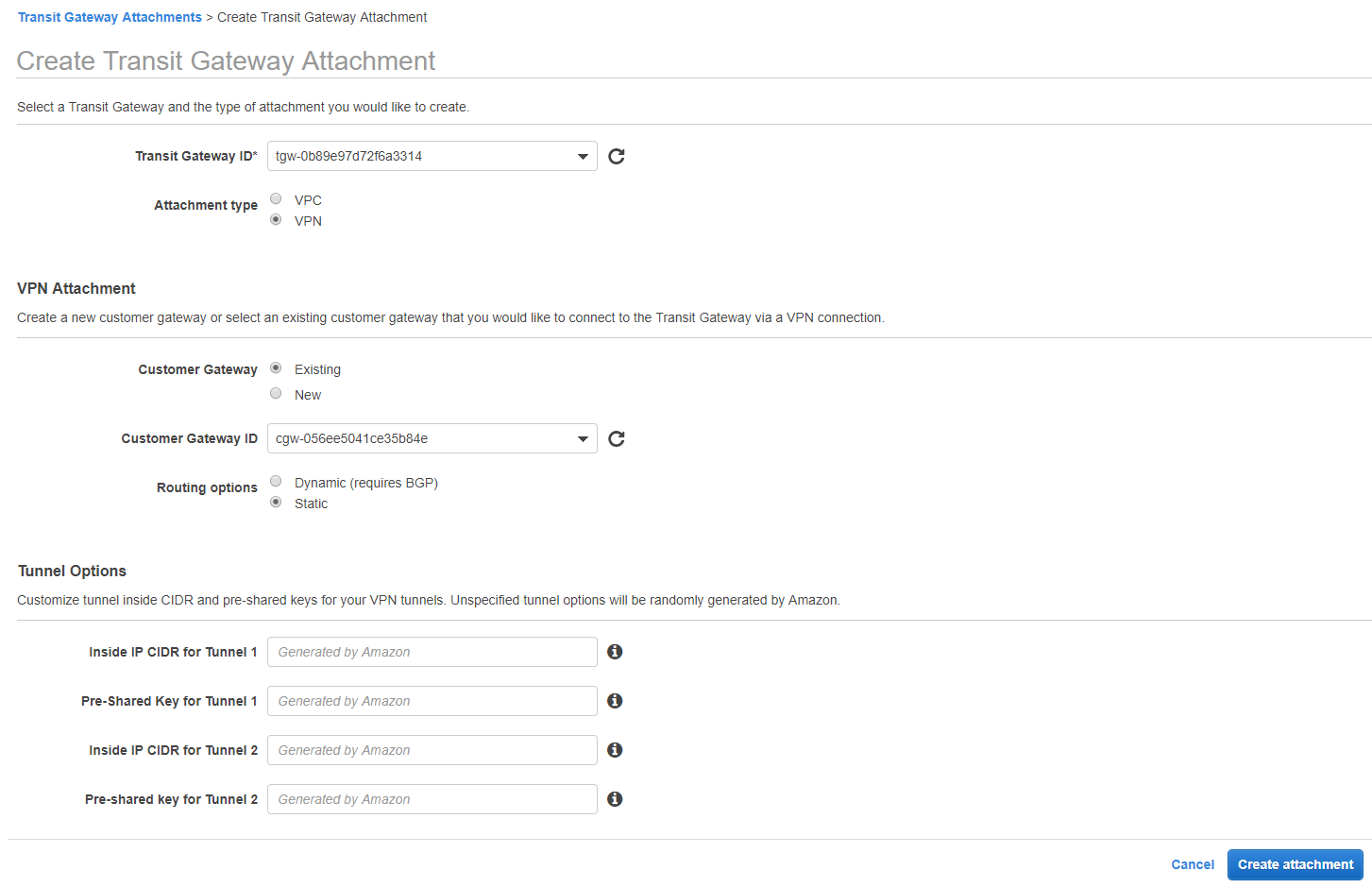This time, when we create the transit gateway attachment, we’ll select VPN. When you select VPN, you’ll then see options for setting up the VPN with an existing Customer Gateway (public data center endpoint for the other end of the VPN) or to create a brand new CGW. You then have the option of using dynamic routing via BGP, or adding static routes. After this, you can specify some specifics for the Tunnel IP or pre-shared keys if you would like but it’s not necessary. Click the “Create attachment” button.