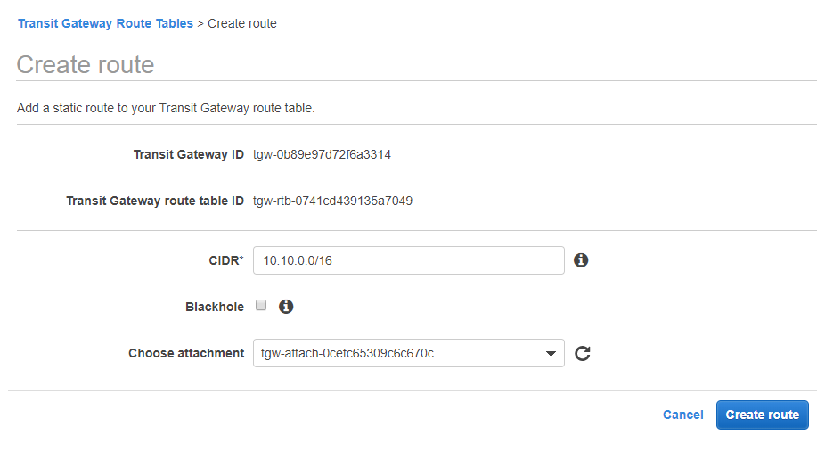 You’ll be able to see the VPN Connection information in the same place you would if you were using a VGW which is under the VPN connection menu. You’ll need the Public endpoint etc to create the VPN connection from the data center side. While the tunnel is coming up though, we’ll also need to add a static route if you didn’t use BGP (like I did), so we’ll go to the “Transit Gateway Route Tables” menu and click the “Create route” button after selecting our Transit Gateway.