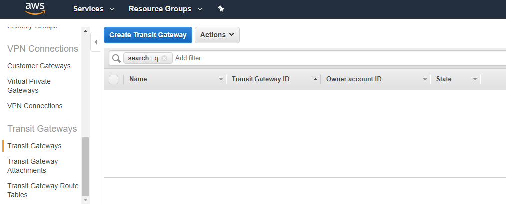 First, lets take a look at setting up the Transit Gateway so that machines in different VPCs can communicate with each other through it. To begin, login to the AWS console under the account you want your Transit Gateway to be owned, and look for the Transit Gateways menu under the VPCs window. Click the “Create Transit Gateway” button.