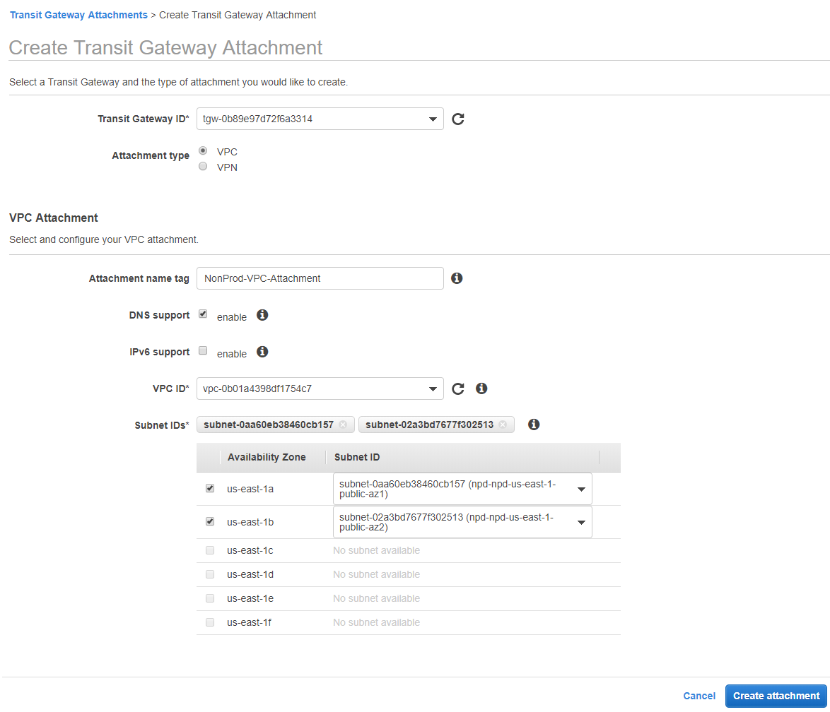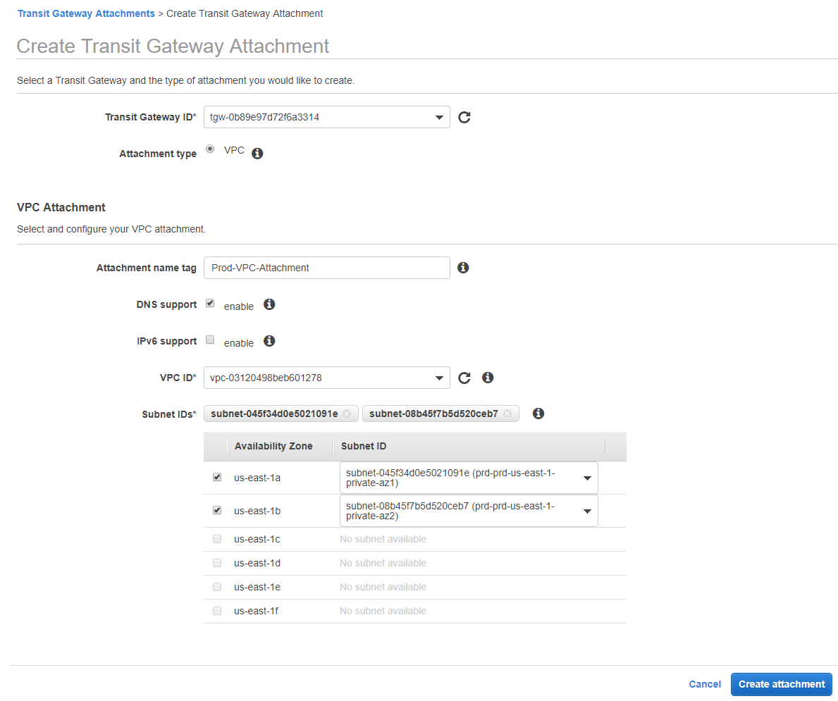 First, Select which transit gateway that should be attached. If you’re just getting started, select the one we built earlier. Under attachment type, select VPC. For the attachment section, give the attachment a name and identify if you want to allow DNS and IPv6 over this gateway. Then select which VPC this Transit Gateway should be connected. Once you select the VPC from the drop down, you’ll also need to select which subnets it will be attached to. It’s best to pick one subnet in each Availability Zone to provide better uptime, but you you may ONLY select one subnet from each AZ. Don’t worry, it can be accessed from the rest of the subnets within the same AZ, but you can only attach it to one subnet per AZ. Click the “Create Attachment” button.